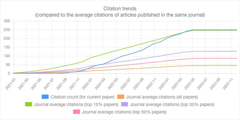 This metric illustrates the citation count over time (represented by the blue line in the graph) in comparison to the average citation count for the journal where the paper was published.